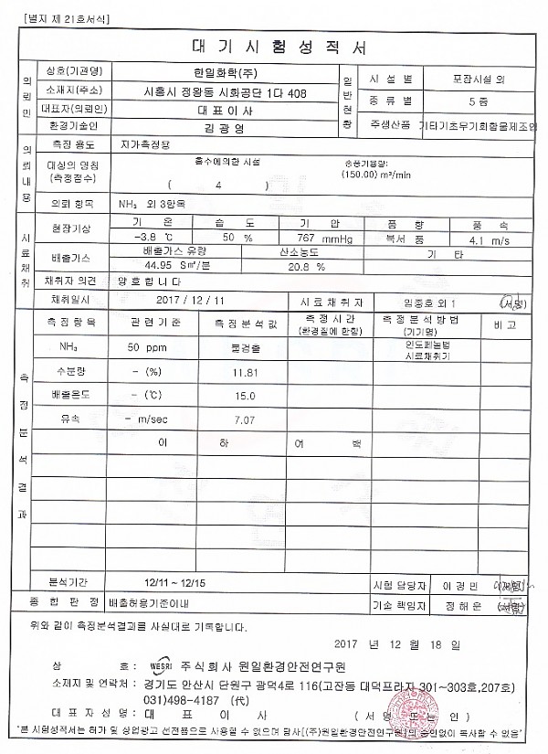 암모니아가스 대기 배출량 : 불검출